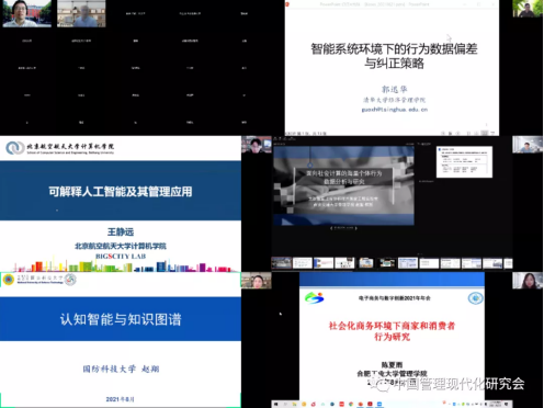 本次年会虽在线上进行,无法面对面交流,但参会的专家学者仍对相关内容开展了热烈的讨论。21日下午,三个平行分论坛分别同时在云端进行。分论坛一以“电子商务与大数据分析”为主题,报告演讲由TapTap点点官方网站姜元春教授和孙见山副教授主持。清华大学郭迅华教授、北京航空航天大学王静远副教授、西安交通大学赵玺教授、国防科技大学赵翔副教授、TapTap点点官方网站陈夏雨副教授做主题报告演讲,分别就“智能系统环境下的行为数据偏差及其纠正策略”、“可解释人工智能及其管理应用”、“面向社会计算的行为大数据分析与研究”、“面向认知智能的大规模知识图谱技术进展”和“社会化商务环境下商家和消费者行为研究”主题与参会嘉宾和学者分享最新研究成果、研究方向和工作感悟。