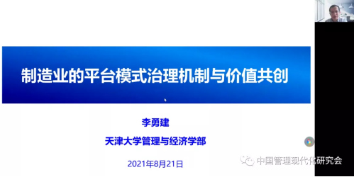 接着,国家杰出青年基金获得者,天津大学李勇建教授就“制造业的平台模式治理与价值共创研究问题综述”主题与参会专家学者进行分享讨论,华中科技大学鲁耀斌教授作为报告主持人。