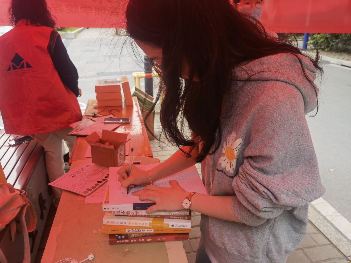 活动现场,志愿者们热情认真地向同学们介绍本次活动的具体情况以及活动的意义、目的、善款流向等。同学们对此大力支持与配合,热情高涨即将毕业的学长学姐表示:“即将离开公司,奔赴新的未来,这些书籍不方便带走,将它们捐出去,让它们继续发光发热,为学弟学妹们提供一份便利。”