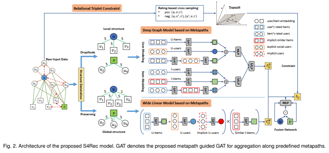 论文聚焦挖掘社交网络关系进行社会化推荐问题,提出了融合语义和结构两个视图的异质图推荐建模方法,通过构建基于图注意力网络的深度图模型和基于奇异值分解的浅层线性网络分别建模用户-物品交互的个性化和一般化行为,并将设计了基于TransH知识图谱表征方法的辅助任务建模用户细粒度评分行为差异,提高模型的泛化能力。