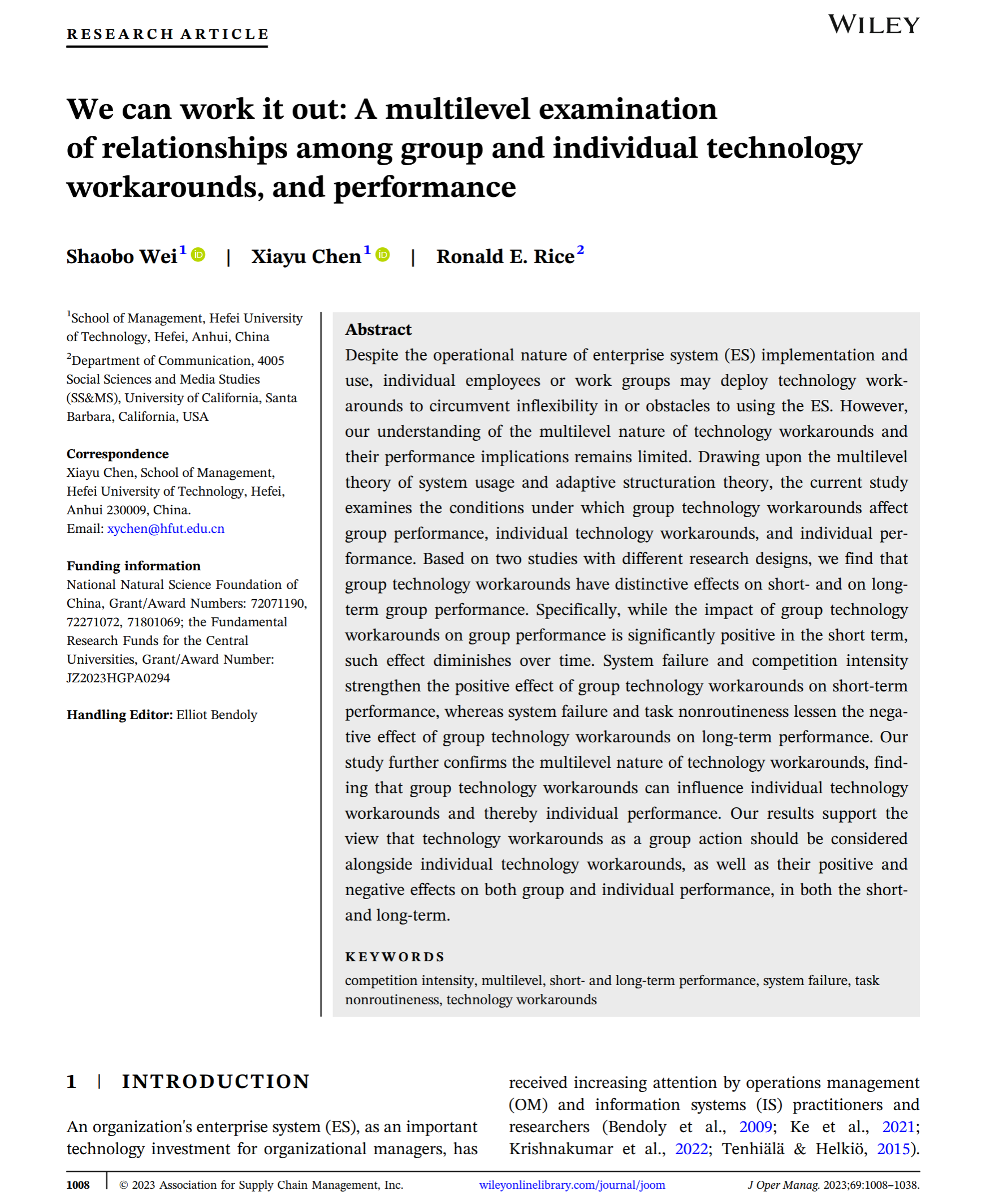 近日,公司魏少波教授团队的研究成果“We Can Work It Out: A Multilevel Examination of Relationships among Group and Individual Technology Workarounds, and Performance”被管理学国际顶级期刊Journal of Operations Management正式发表(Wei, S., Chen, X., and Rice, R.E. 2023. "We Can Work It Out: A Multilevel Examination of Relationships among Group and Individual Technology Workarounds, and Performance," Journal of Operations Management (69:6), pp. 1008-1038)。魏少波教授为论文第一作者,陈夏雨副教授为论文通讯作者。