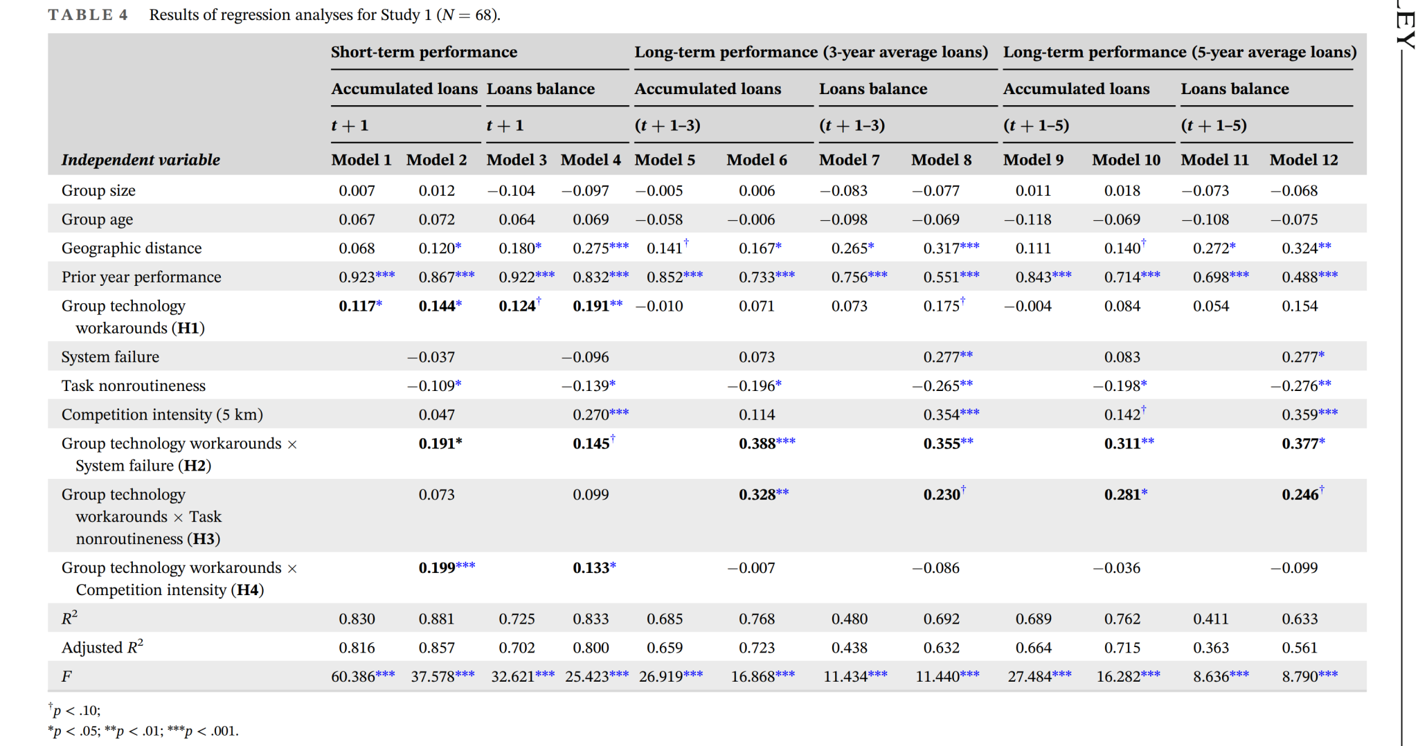 论文聚焦信息系统领域新出现的变通式使用问题,基于系统使用的多层次理论和自适应结构理论,提出了团队变通式使用如何影响团队绩效、个体员工变通式使用以及个体绩效的研究框架。基于两个完全不同的研究设计,结合二手数据和一手数据,纵向跟踪长达数年,发现团队变通式使用对短期和长期的团队绩效有不同的影响。虽然团队变通式使用对团队短期绩效有显著积极的影响,但这种影响随着时间的推移逐渐减弱。系统中断和竞争强度会增强团队变通式使用对短期绩效的正面影响,而系统中断和任务非例行性会减弱团队变通式使用对长期绩效的负面影响。