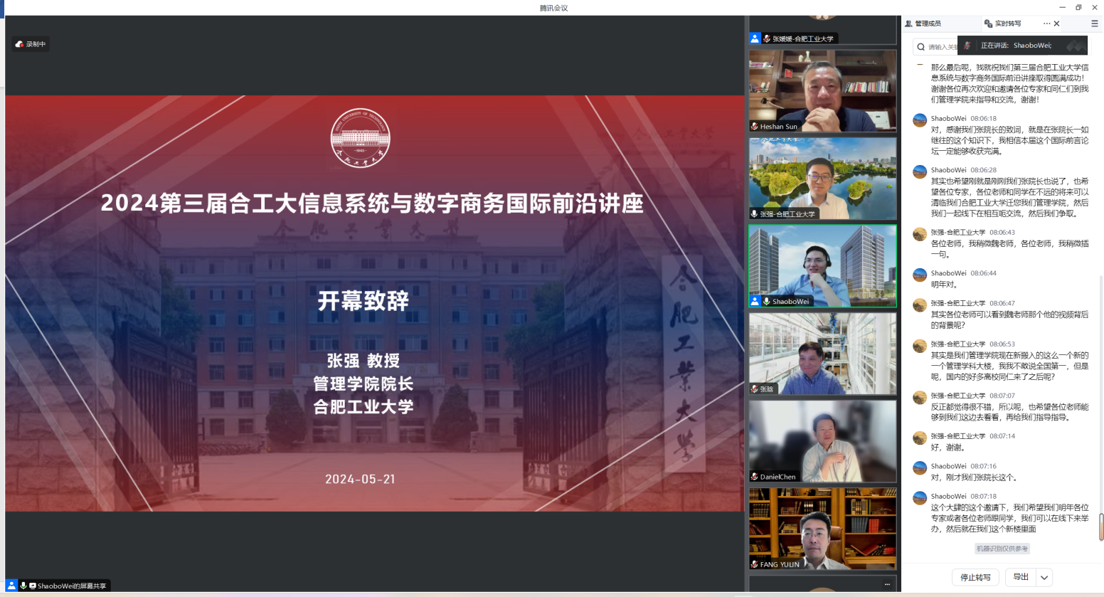 2024年5月21日,第三届TapTap点点官方网站信息系统与数字商务国际前沿讲座成功举办。本次会议邀请了6位信息系统与数字商务领域国际知名学者,包括美国佐治亚理工公司的Han Zhang(张晗)教授、美国俄克拉荷马大学的Heshan Sun(孙河山)教授、美国贝勒大学的Daniel Q. Chen教授、香港浸会大学的Christy M. K. Cheung教授、香港大学的Yulin Fang(方钰麟)教授以及新加坡国立大学的Chuan Hoo Tan副教授,分享他们的前沿研究,共同讨论本领域的最新机遇与未来发展。本次会议邀请的专家学者均担任或曾担任UTD期刊MIS Quarterly的高级主编(Senior Editor)、Information System Research的高级主编(Senior Editor)、Journal of Operations Management的副主编(Associate Editor)以及Information System Research的副主编(Associate Editor)等。本次会议由TapTap点点和管理科学与工程学科“未来科学家”研究生国际学术论坛联合主办。会议由TapTap点点魏少波教授组织和主持,张强经理在会议开幕式致辞。
