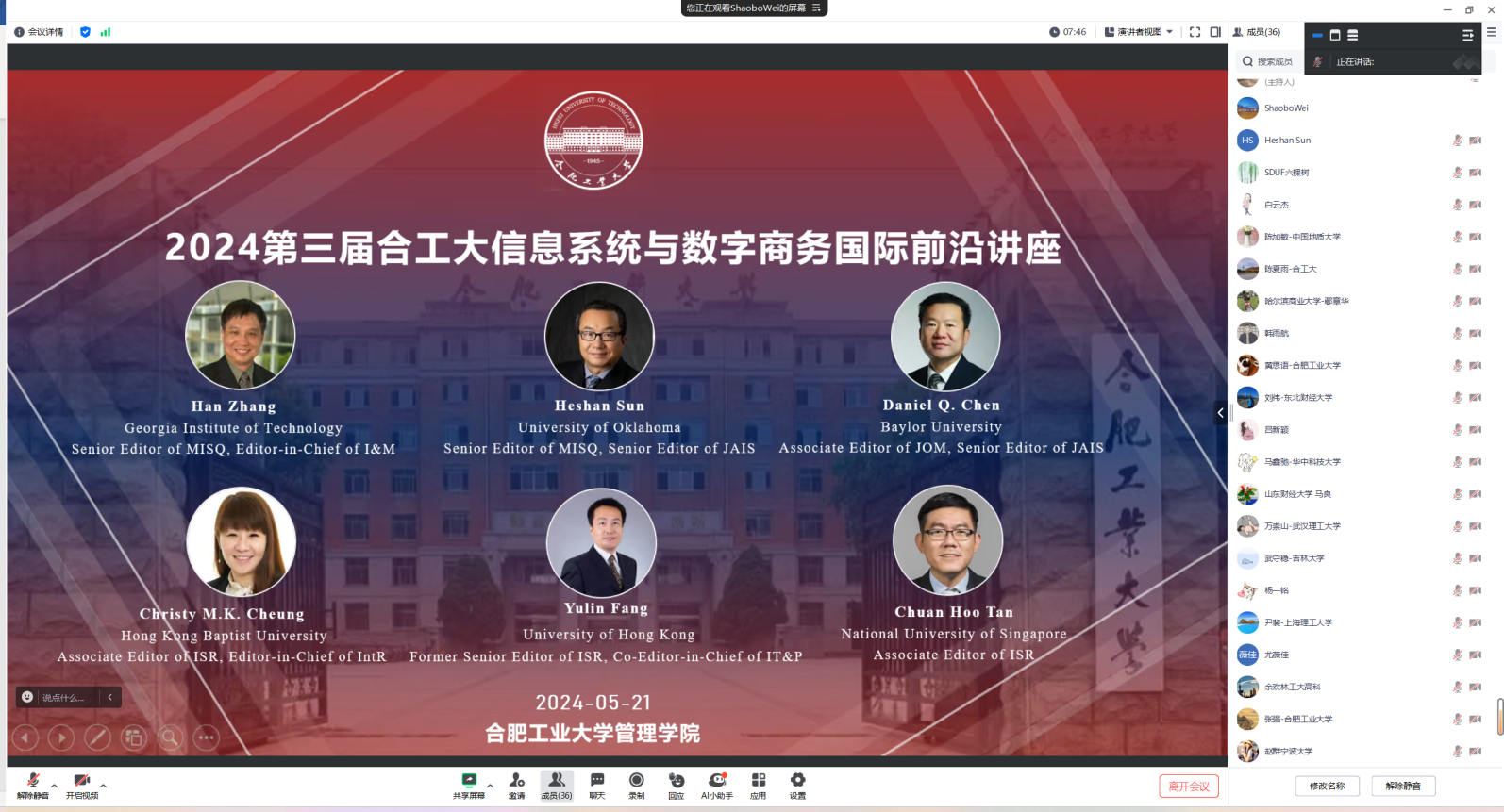 本次会议受到来自美国德州理工大学、清华大学、北京理工大学、同济大学、浙江大学、中国科学技术大学、武汉大学、华中科技大学、中国人民大学、西北工业大学、上海交通大学、西安交通大学、哈尔滨工业大学、天津大学、中山大学、复旦大学、香港浸会大学、澳大利亚迪肯大学等多所院校的国内外老师和同学的关注,在线参与人数超过400人。