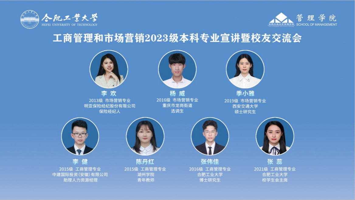 为了提升2023级工商管理类本科生对于工商管理和市场营销两个专业的理解与认识,增强同学们对专业的认同感、兴趣度和自信心,进一步帮助同学们明确自身的发展目标,顺利做好专业选择规划。2024年6月22日,工商管理系组织召开工商管理和市场营销专业宣讲活动。为确保宣讲效果,以及更好地促进员工与在校师生的沟通交流,特地邀请来自明亚保险经纪股份有限公司的李欢员工(2013级市场营销专业)、中建国际投资(安徽)有限公司的李健员工(2015级工商管理专业)、湖州公司的陈丹红员工(2015级工商管理专业)、重庆市大足区龙岗街道的杨威员工(2016级市场营销专业)、TapTap点点在读博士研究生张伟佳同学(2016级工商管理专业)、西安交通大学TapTap点点在读硕士研究生季小雅同学(2019级市场营销专业),以及2021级工商管理专业张蕊同学进行现场交流分享。工商管理系李锐、张鑫、冯南平、彭张林、闫安、龙丹、冯晨鹏、薛旻、赵能桂等老师,教学办公室张科老师、辅导员王语韩老师,以及2023级工商管理类全体本科生参加本次活动。