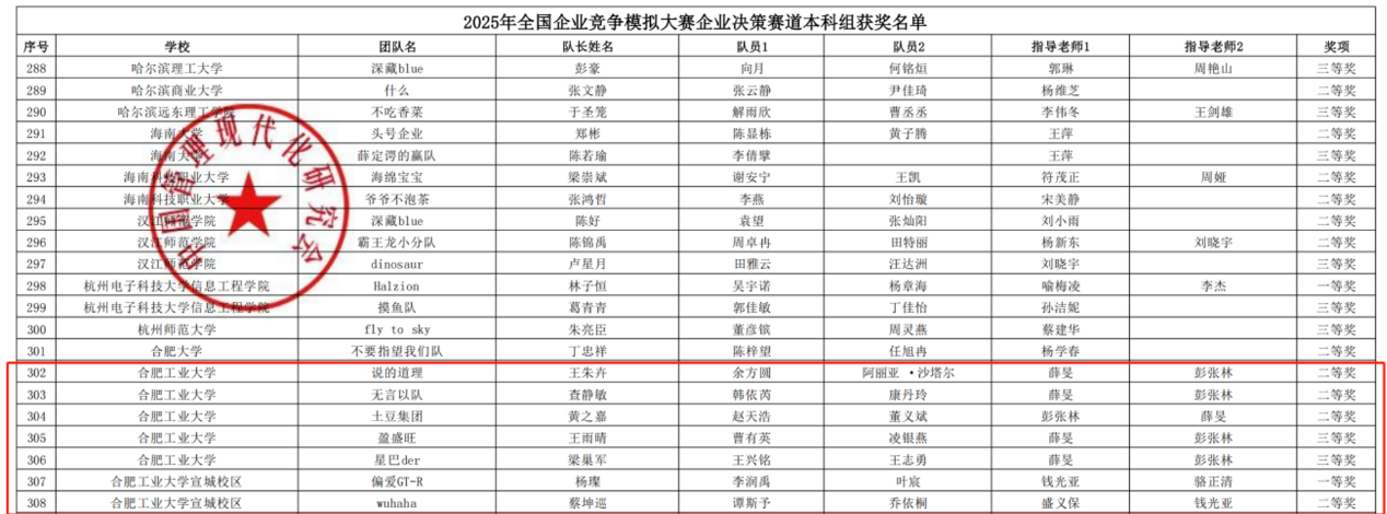 5月16-18日,由中国管理现代化研究会决策模拟专业委员会主办的2025年全国企业竞争模拟大赛现场总决赛在西南财经大学举办。由公司钱光亚与骆正清老师指导的物流管理专业本科生杨璨、李润禹、叶宸等同学获企业决策赛道全国一等奖,薛旻与彭张林老师指导的工商管理专业本科生王朱卉、余方圆、查静敏、康丹玲,市场营销专业本科生阿丽亚·沙塔尔、韩依芮,盛义保与钱光亚老师指导的物流管理专业本科生蔡坤巡、谭斯予、乔依桐等同学获企业决策赛道全国二等奖,共斩获全国一等奖1项、全国二等奖4项、全国三等奖2项。