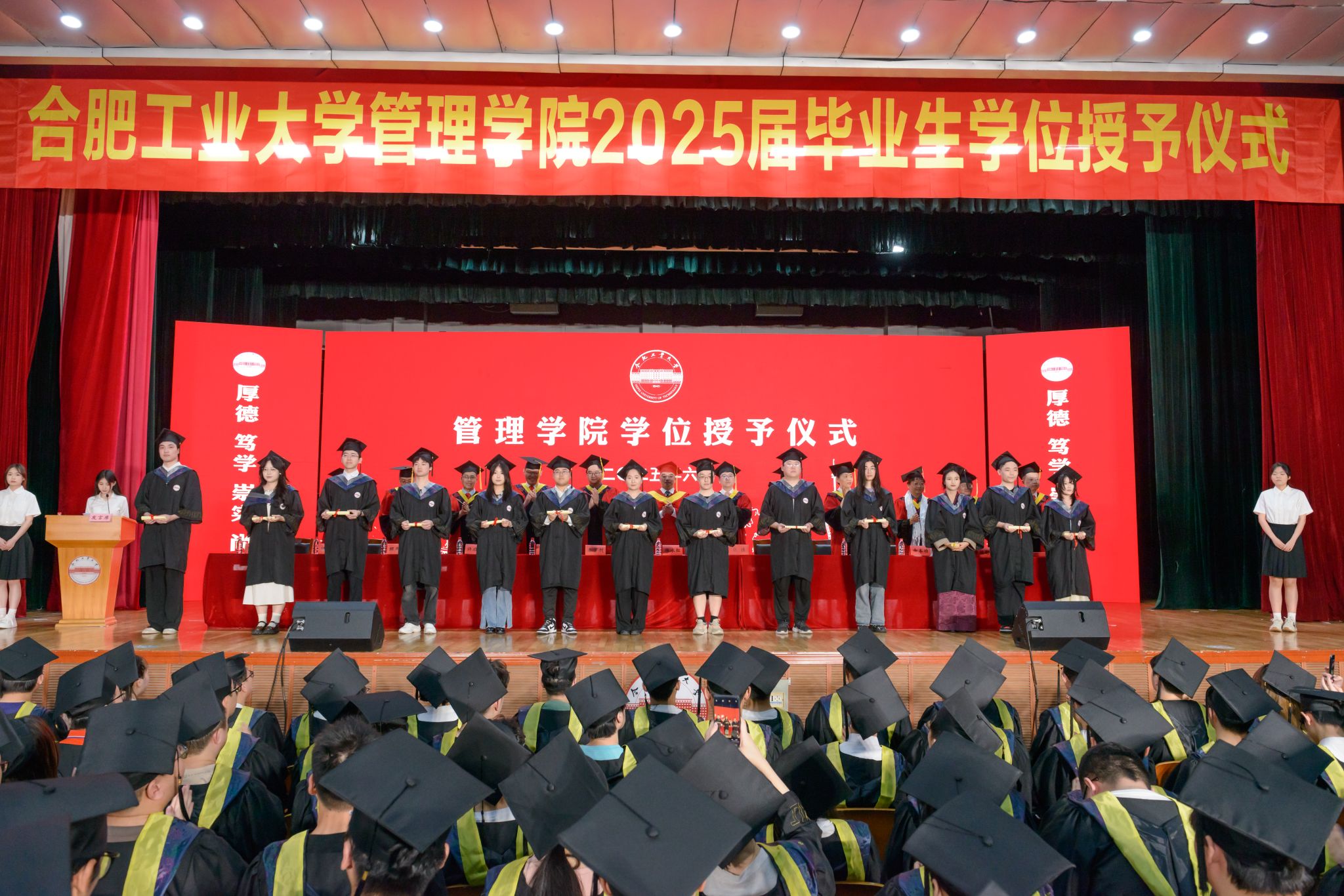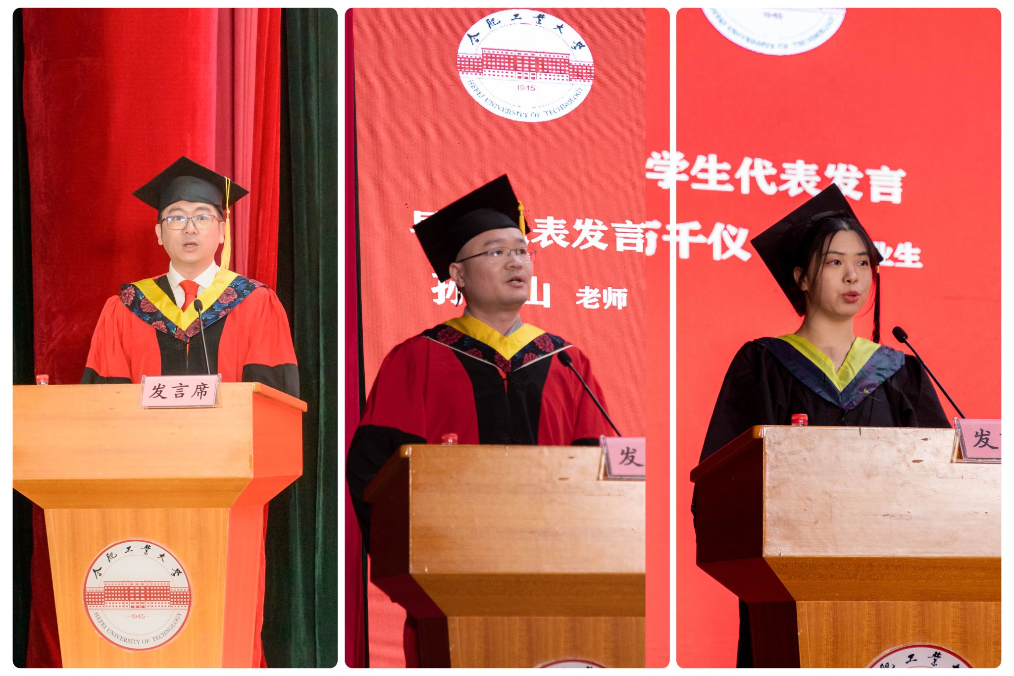 教师代表孙见山向毕业生表示祝贺,并以“继续保持终身学习的能力”“续培养应对不确定性的定力”“继续坚守内心的价值坐标”三个方面送上最诚挚的祝福。安徽省优秀毕业生获得者万千仪代表毕业生感恩公司、老师的培养和同学的陪伴,号召毕业生扎根实践、锐意创新;更希望大家坚守初心、满怀热爱——让青春在为祖国、为人民、为时代的奋斗中焕发光彩!