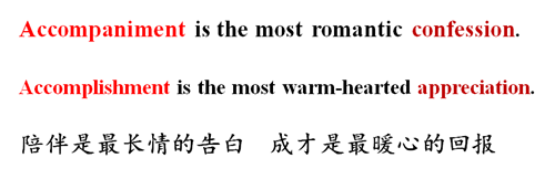 (1) 这句其实是今年中秋【每日一思】的结语。实际上,是先有中文“陪伴是最长情的告白,成才是最暖心的回报”,然后才有译文 “Accompaniment is the most romantic confession; Accomplishment is the most warm-hearted appreciation.”。