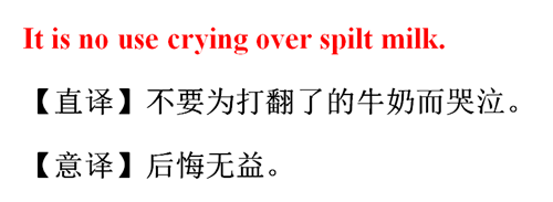 (1) 这句话可以直译为“牛奶打翻了,哭也没用”;也可意译为“覆水难收;后悔无益”。“直译”和“意译”是翻译的两种方法,“直译”可以保持原作的丰姿和风格,有助于读者深入了解源语所包含的意象;“意译”更接近目标语读者的阅读偏好。究竟是直译好还是意译妙?陆殿杨先生提出了一条原则:“Translate literally, if possible, or appear to free translation. (能直译就尽量直译,不能直译就采取意译)”。