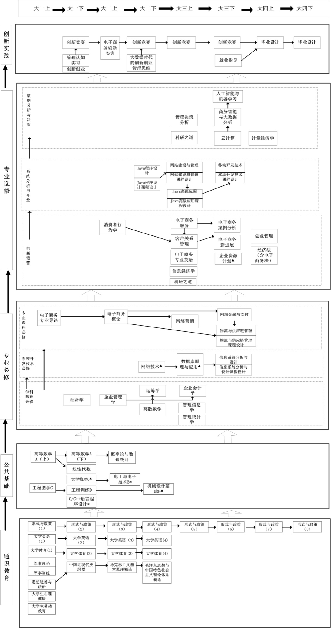 电子商务专业英语(32学时2学分)、经济法(含电子商务法)(32学时2学分)、电子商务服务(32学时2学分)、客户关系管理(32学时2学分)、消费者行为学(32学时2学分)、Java程序设计(32学时2学分)、Java高级应用(32学时2学分)、网站建设与管理(32学时2学分)、移动开发技术(32学时2学分)、云计算(32学时2学分)、商务智能与大数据分析(32学时2学分)、人工智能与机器学习(32学时2学分)、管理决策分析(32学时2学分)、企业资源计划(32学时2学分)、电子商务新进展(32学时2学分)、信息经济学(32学时2学分)、电子商务案例分析(32学时2学分)、计量经济学(32学时2学分)、创业管理(32学时2学分)、科研之道(32学时2学分)、管理认知实习(24学时1学分)、Java程序设计课程设计(60学时2学分),网站建设与管理课程设计(60学时2学分)、Java高级应用课程设计(60学时2学分)、移动开发技术课程设计(48学时2学分)、电子商务创新实训(60学时2学分)。