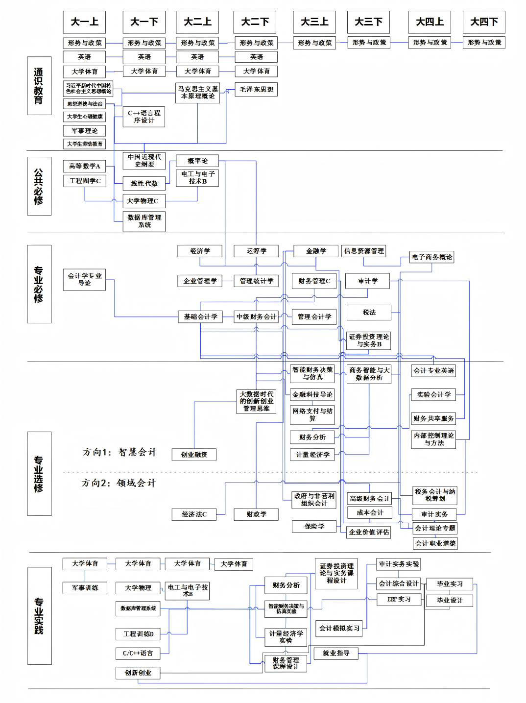 方向I:智慧会计方向(12门),共18学分。会计专业英语(32学时2学分)、商务智能与大数据分析(32学时2学分)、智能财务决策与仿真(24+8学时2学分)、实验会计学(16学时1学分)、财务共享服务(16学时1学分)、网络支付与结算(32学时2学分)、内部控制理论与方法(16学时1学分)、创业融资(16学时1学分)、财务分析(32+8学时2.5学分)、计量经济学(32+8学时2.5学分)、金融科技导论(16学时1学分)、大数据时代的创新创业管理思维(32学时2学分)。