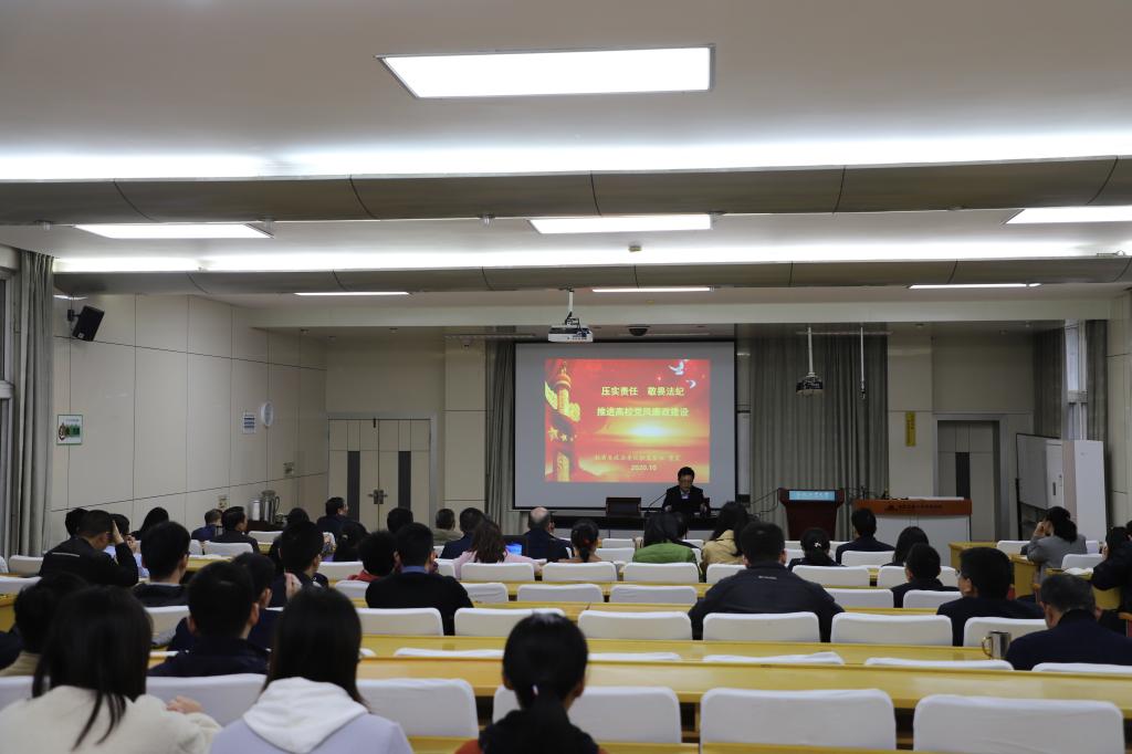 董震首先介绍了当前高公司党风廉政建设面临的形势,总结了高校违纪违法案件的五大特点,报告中列举的一个个案例,案件中呈现的一组组数字让教师党员们深刻认识到党中央反腐肃纪的坚强决心,深刻理解了零容忍态度不变,越往后执纪越严的内涵。随后,他聚焦二级党组织如何发挥好七大主体责任,传导好四层责任,压实监督责任等做了详细的分析和阐述,希望党员干部履职尽责,共同推进党风廉政建设。最后,他结合教师的职业特点,重点围绕如何加强教师党员的政治纪律建设提出了建议和要求,希望党员教师明规矩、守法纪、知敬畏,做人民满意的好老师。