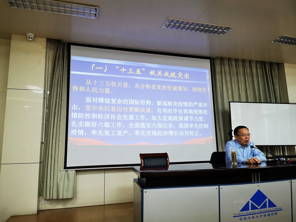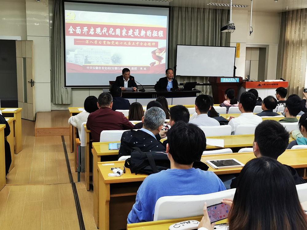 会上,张彪教授从十九届五中全会召开完成主要议程与重大意义、深刻认识与准确把握“五新”重要判断与实践要求、牢牢把握2035年远景目标和十四五发展目标、坚持党的全面领导为实现“规划”和“远景”目标不懈奋斗四个方面对习总书记在党的十九届五中全会上的重要讲话和十九届五中全会精神进行了全面系统深入的解读。并结合安徽省的经济发展情况和管理学科的发展应用,提出新时代应坚持党的全面领导,为实现“规划”和“远景”目标不懈奋斗。