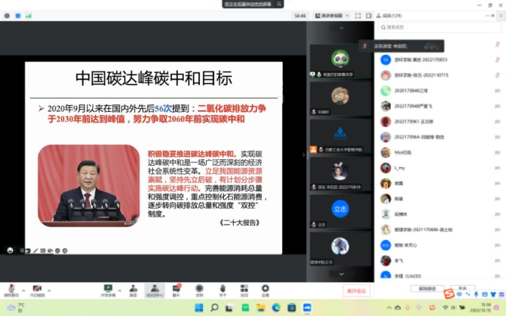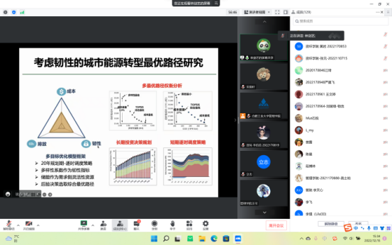 林剑艺在分享中表示,“积极稳妥推进碳达峰碳中和”,是以习近平同志为核心的党中央统筹国内国际两个大局作出的重大决策部署,为推进碳达峰碳中和工作提供了根本遵循。在“双碳”背景下,城市需要处理好经济发展与碳减排之间的关系,碳达峰碳中和理论与规划是未来城市发展研究的必然路径。林剑艺还介绍了国内有关城市为达到“双碳”目标正在积极尝试的方式方法,并以自己所在团队曾经做过的城市规划为例进行了深入分析,让同学们进一步理解到了该研究的现实意义。最后,他热情地与同学们交流,并鼓励同学们要多关注现有的研究和数据,找到自己感兴趣的研究目标。