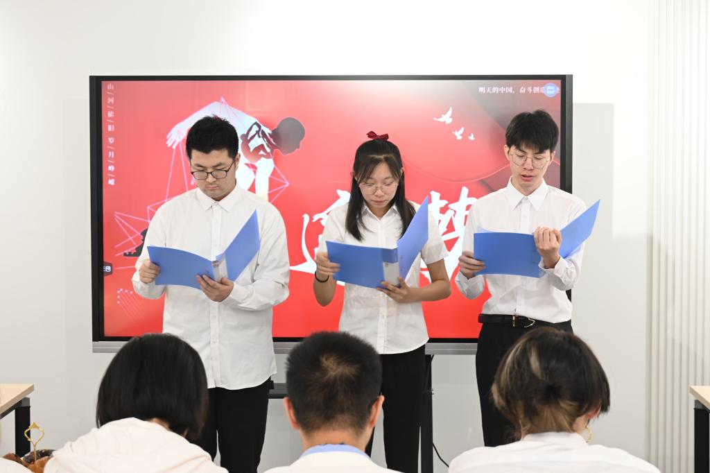 活动伊始,主持人徐欣宇以最新国家形象网宣片《PRC》带领同学们感受祖国筚路蓝缕的建设浪潮与砥砺奋进的强国之路。随后,“以诗歌之炬,励青春之志”晨曦诗会正式开始,以诗诵情,以歌咏志,厚植家国情怀,涵养进取品格。诗会的第一篇章“浴火前行·开辟新天地”以诗朗诵《我是一艘船》开篇,歌颂了“百年红船”乘风破浪、领航中华民族伟大复兴的壮阔历程;诗朗诵《可爱的中国》传递先辈们的信仰与革命精神,昂起不屈头颅,挺起时代脊梁。第二篇章“激流勇进·开创新时代”以《中国阻击战》开篇,深情歌颂在同新冠肺炎疫情的殊死较量中,中国人民和中华民族以敢于斗争、敢于胜利的大无畏气概;诗朗诵《追梦》讲述了脱贫攻坚的故事,举全党全国之力,咬定目标、团结一心,兑现了“一个也不能少”的承诺。第三篇章“锦绣中华·开启新征程”以李大钊先生的名篇《青春》开篇,同学们高唱“以青春之我,创建青春之国家,青春之民族”,担当青春使命,贡献青春力量;诗朗诵《精神的力量》带领大家深刻领会中国共产党人的精神,咬定青山不放松,击鼓摧征阔步行,将诗会气氛推向高潮。最后,全场师生共同挥舞国旗,合唱《我和我的祖国》。