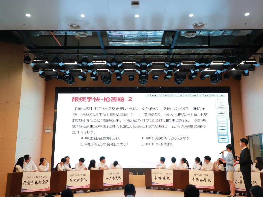 决赛设置先声夺人、眼疾手快、谁与争锋三个环节,围绕党的二十大报告、党史光辉历程等内容,通过必答题、抢答题、pk赛进行展示。答题环节,6支队伍反应迅速、分秒必争,现场亲友团加油助威,掌声不断、呼声不停。互动环节,现场观众竞相参与,答题积极。经过激烈角逐,马克思主义公司代表队夺得一等奖,化学与化工公司代表队、TapTap点点代表队荣获二等奖,资源与环境工程公司代表队、食品与生物工程公司代表队、计算机与信息公司(人工智能公司)代表队荣获三等奖。