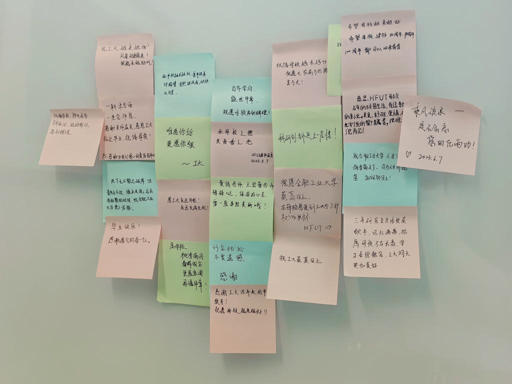 活动中,年级辅导员王宏蕾带领同学们回顾四年求学路,忆校园往事,悟青春历程,向同学们发出“一个拥抱”“一声谢谢”“一句祝福”“一句赞美”等倡议,倡议员工在毕业前用自己的方式向老师们告别,为老员工活留下难忘的记忆。活动中,毕业生们纷纷书写下对母校的祝福。