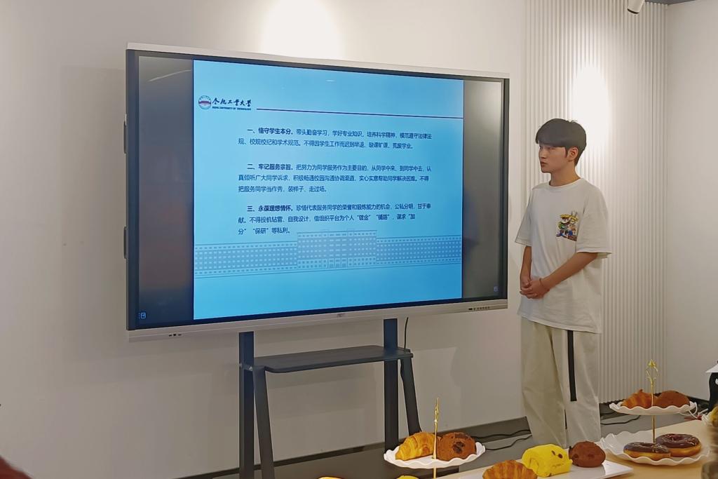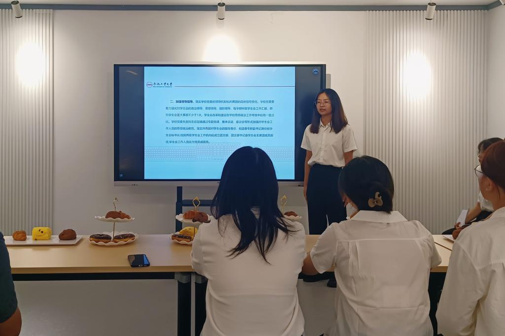 员工会主席团成员石岩同学带领学习《关于巩固高校员工会(研究生会)改革成果的若干措施》的通知,倡导员工会成员们做到把牢政治方向、加强领导指导、当好桥梁纽带、抓实队伍建设、提升服务实效、创新组织模式、优化项目运行、强化考核评价、坚持从严治会、压实工作责任。