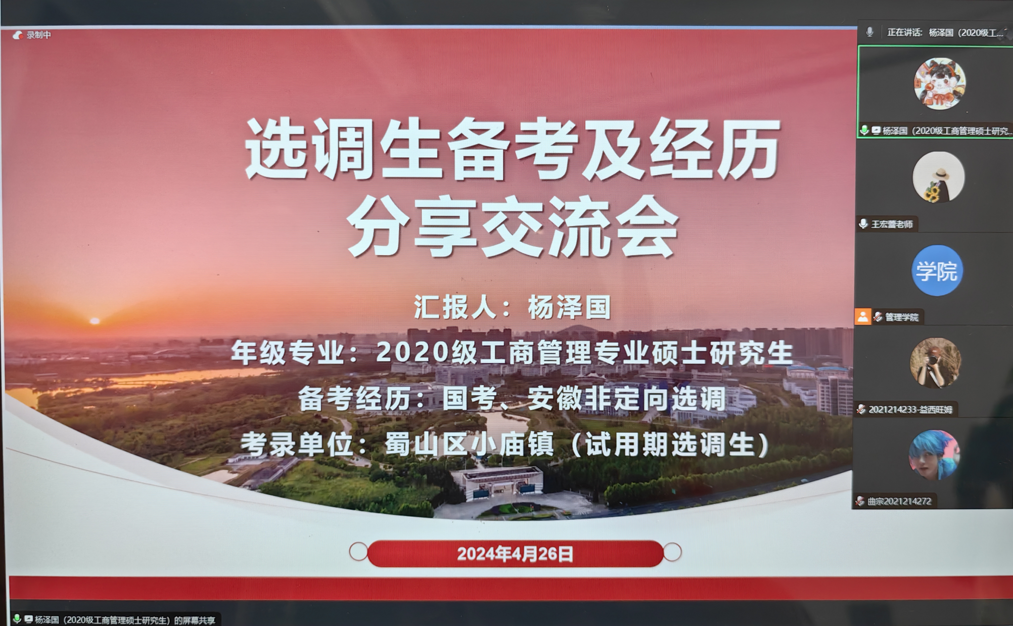分享会上,工商管理专业21届本科毕业生、青海省选调生吴玉莹、工商管理专业23届硕士毕业生、安徽省选调生杨国泽和信息管理与信息系统专业23届本科毕业生、安徽省选调生李悦分别从选调生的报考条件、招录流程、备考准备、现实工作情况以及自身收获,讲述对于选调生工作的见解与认识,分享备考过程中以及考试期间的经验与方法,总结出在备考期间面对难题的独特的应对技巧,并为同学们答疑解惑。