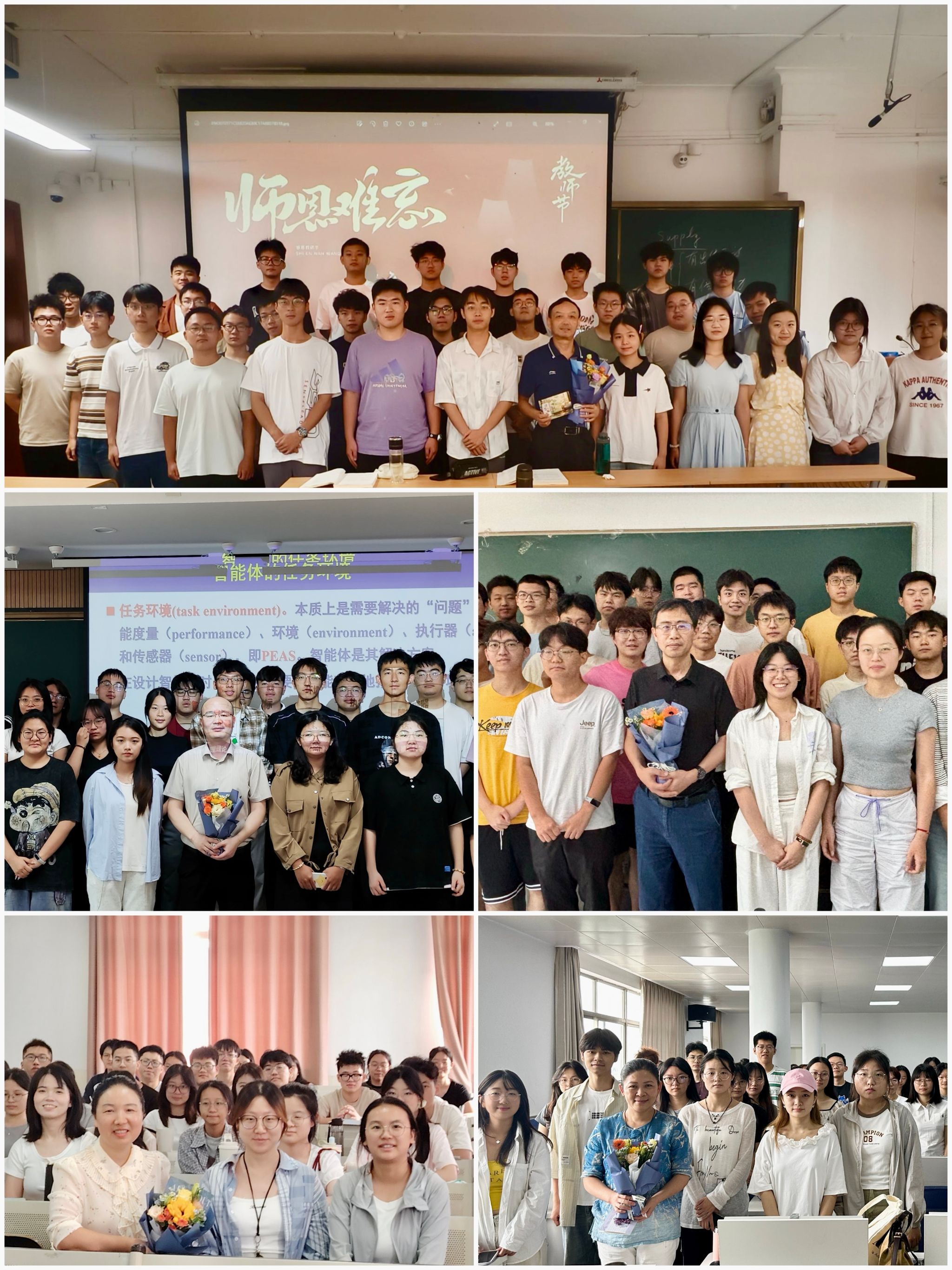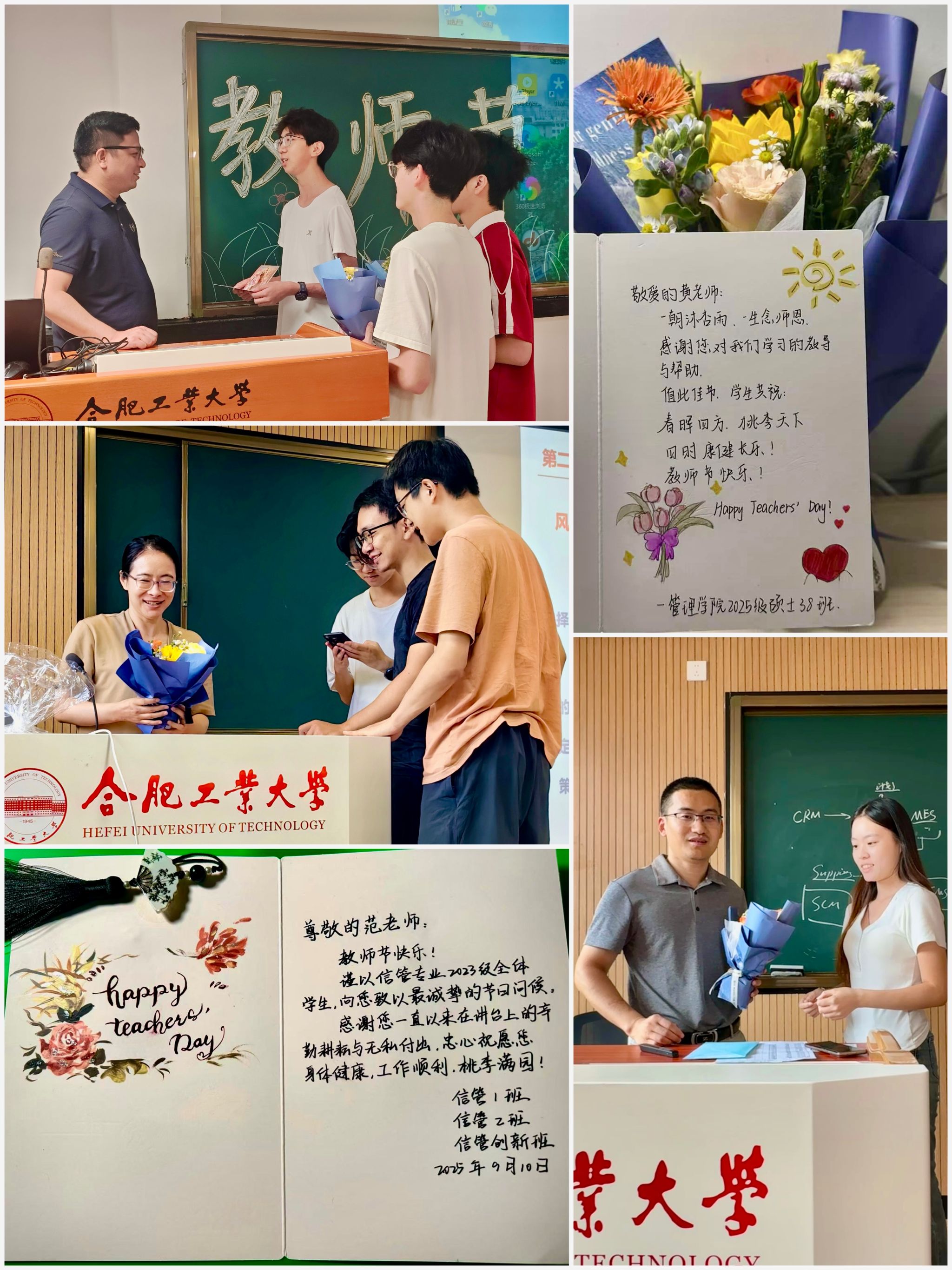 活动前期,公司指导班级骨干精心书写祝福卡片,暖心设计班级专属特色活动,引导员工珍惜校园时光,感恩老师的谆谆教诲与温暖陪伴。活动当天,各年级员工代表手捧花束、怀揣贺卡,向任课教师逐一送上祝福,一句句“老师您辛苦了”“祝您节日快乐”,让敬意在面对面的交流中自然流淌。此外,不同年级还打造了专属感恩场景:2024级本科生精心设计教师节主题电脑壁纸,课前提前投放在教室白色幕布上,让教师走进课堂便感受满屏暖意;2023级本科生以合唱《听我说谢谢你》为礼,悠扬歌声里满含对教师辛勤付出的感恩;2025级研究生集体诵读祝福语,现场掌声与欢呼声不断。