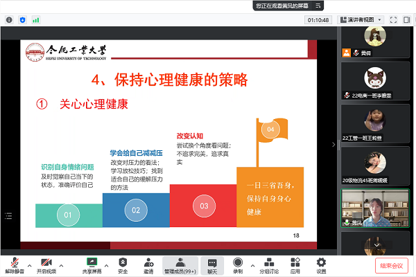 首先,黄凤向同学们讲解了作为心理骨干的工作职责,鼓励大家要积极参加各类心理培训、在班级开展心理活动以及关心关爱班级同学。接着,她从什么是心理健康、老员工常见的心理问题、如何关心重点关注员工、保持心理健康的技巧等问题入手,结合相关实例,生动讲解心理知识。最后,她详细讲解了对于老员工常见的心理危机应该如何识别与初步干预。