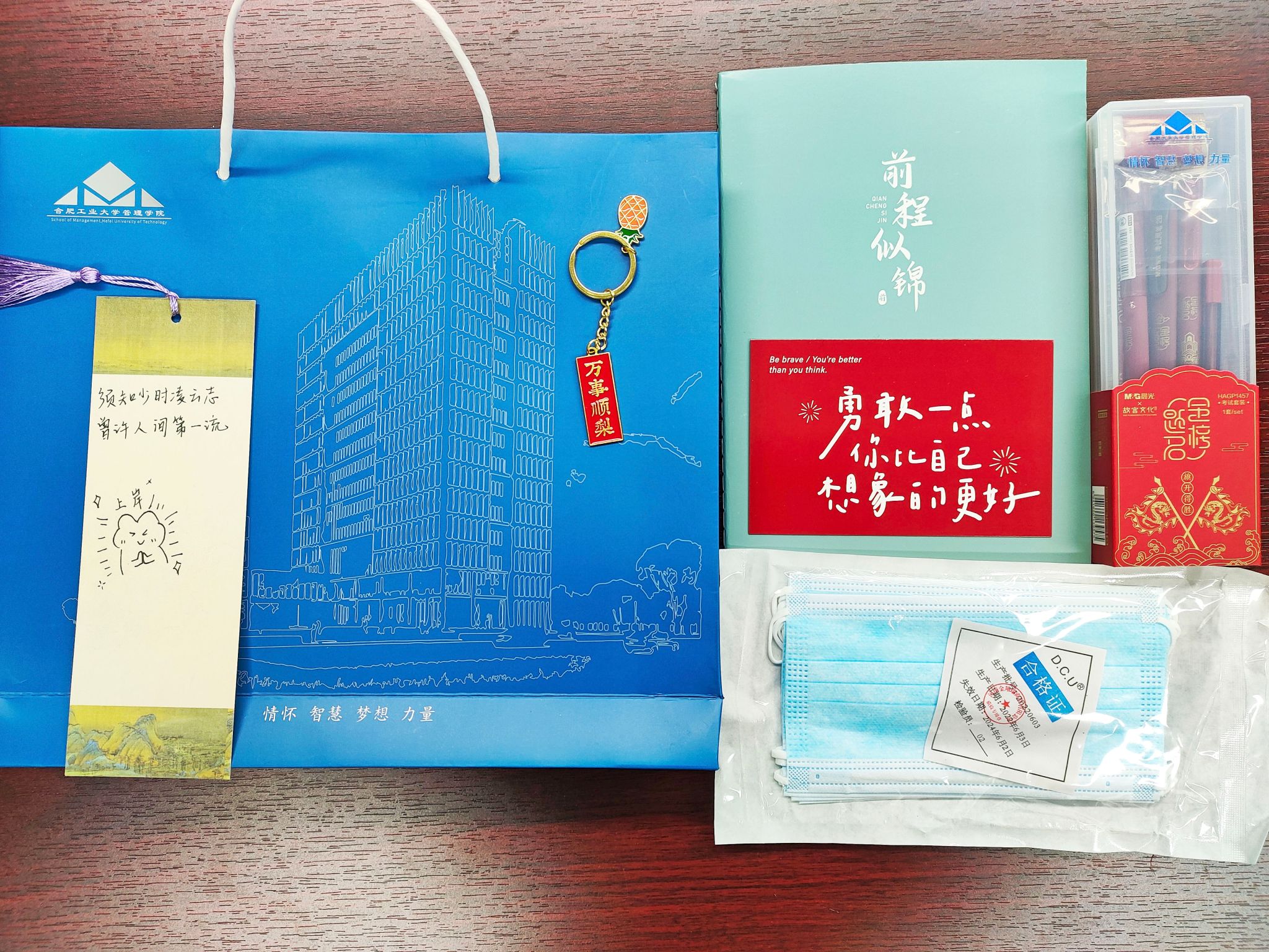 公司提前谋划布置,依托员工党支部组织各年级党员、发展对象、积极分子组成志愿队,将含有管院logo的文具套装、印有“前程似锦”、“顶峰相见”、“万事顺梨”等美好寓意的本子、明信片和钥匙扣,以及由低年级员工写给考研员工的书签等分装进182份“加油包”,然后带到宿舍亲自送到考研学子手上。员工们在收到礼包后十分感动,纷纷感谢公司和学弟学妹们的暖心鼓励和诚挚祝福。