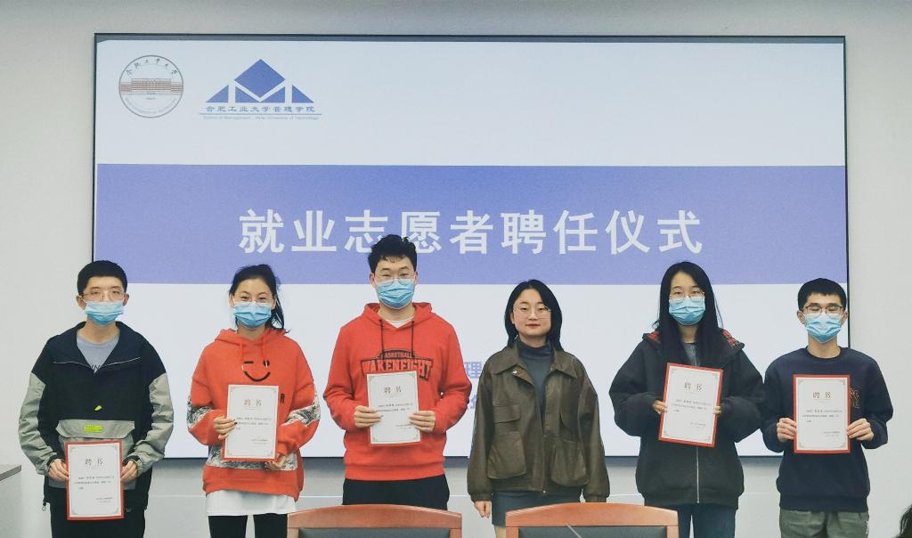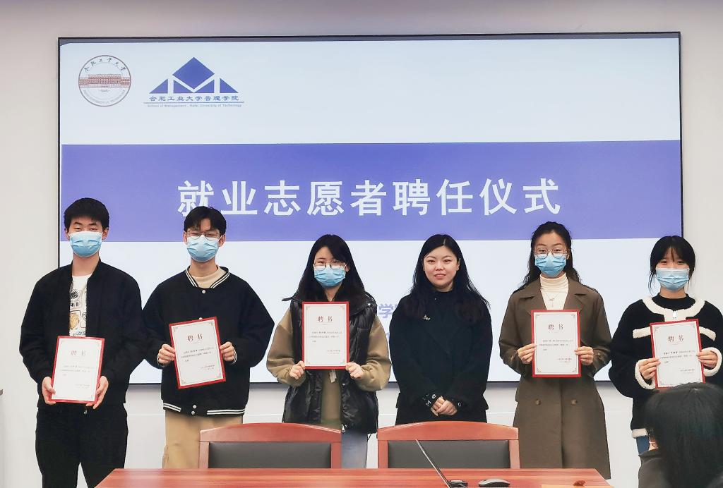 仪式上,公司员工工作办公室副主任王宏蕾、毕业班辅导员向海群向就业志愿者们颁发聘书。王宏蕾介绍了志愿者岗位职责,分析当前就业形势、市场需求以及各专业员工就业意愿和签约情况,要求志愿者们提高认识、明确责任、了解同学、积极反馈。向海群讲解了具体的工作要求和实施办法。就业志愿者们一直认为责任重大,将主动做好就业信息传递、就业指导帮扶、心理调适等工作。