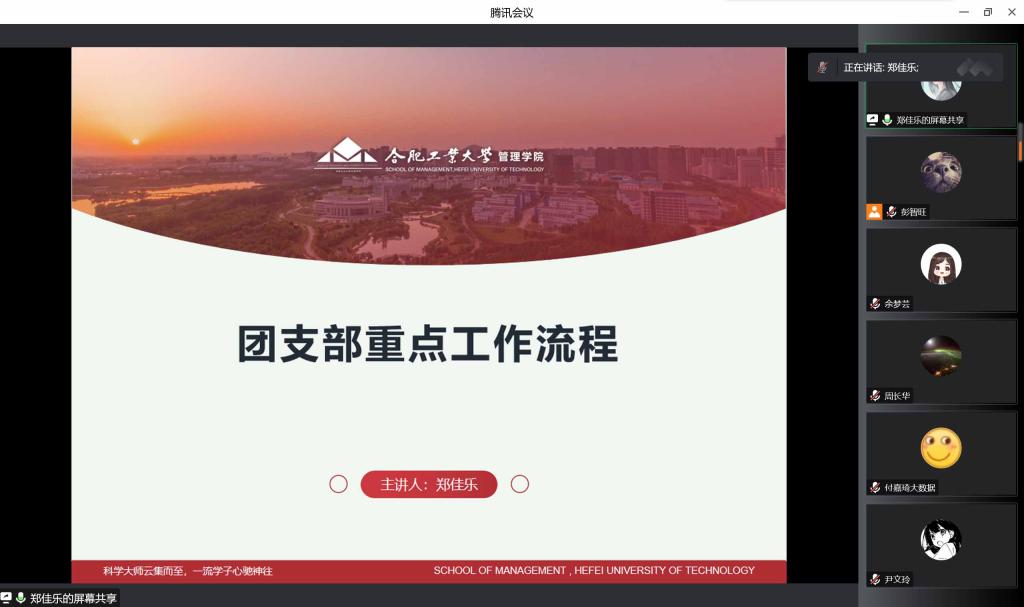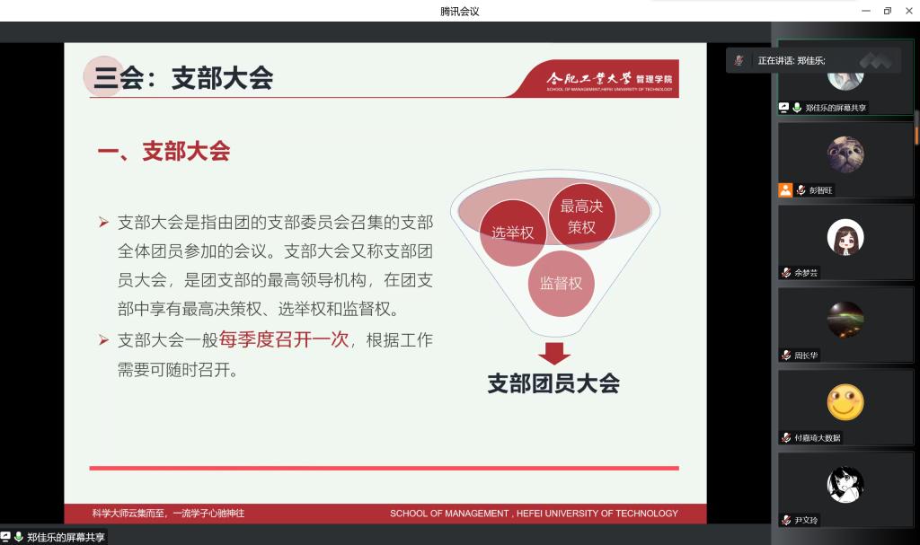 公司员工团委副书记、电子商务20-1班郑佳乐从“三会两制一课”和团支部特色活动两大方面分享了开展团支部工作的经验,她详细介绍三会两制一课的制度内容、制度要求,举例支部工作的开展方式,利用“志愿汇”“学习强国”“中国青年报”等学习平台,激发团学骨干的工作灵感与热情,让团组织成为一支具有先进性、具有生命力、充满活力的队伍。