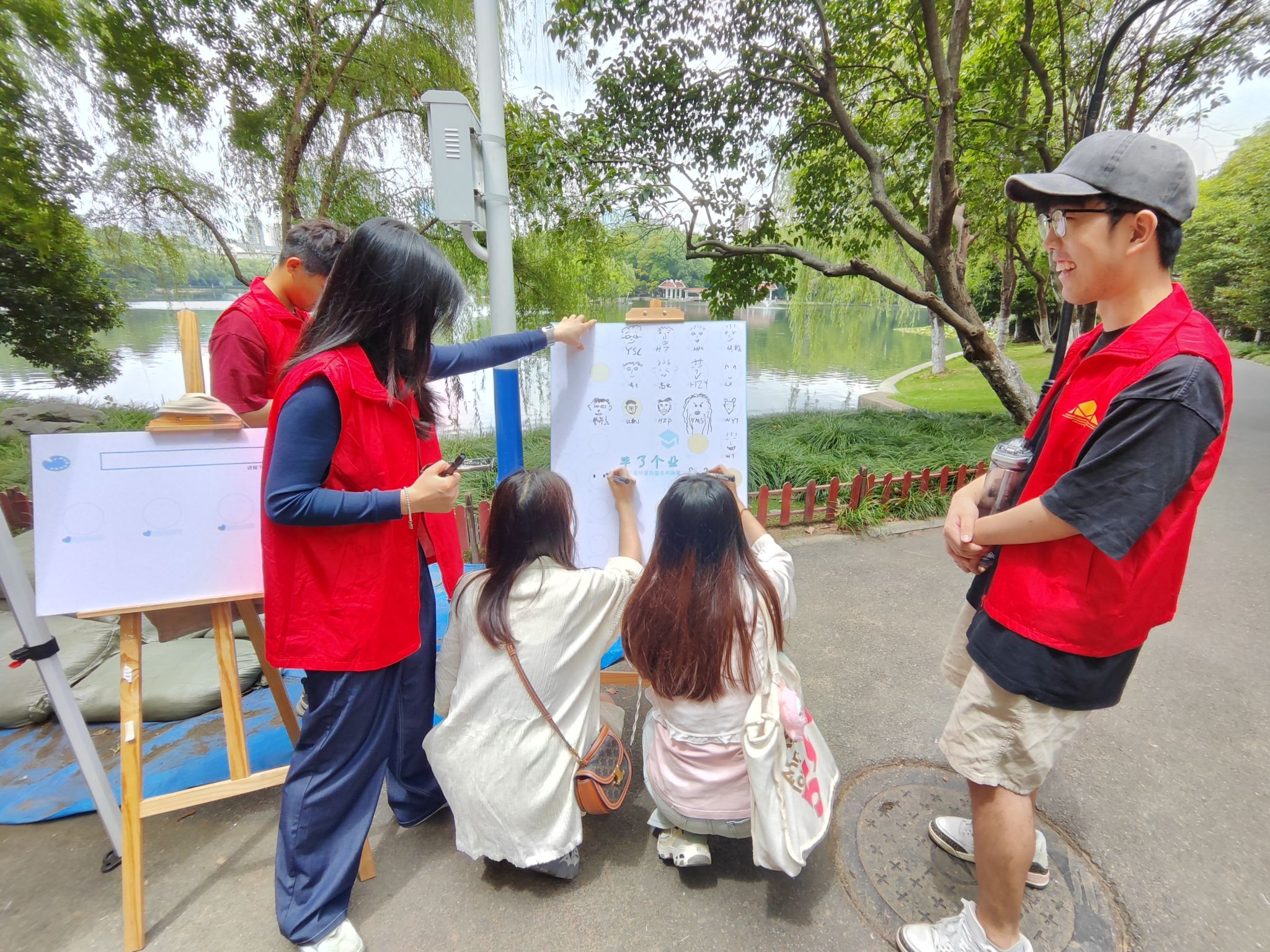 活动开始后,路过的员工纷纷驻足询问活动内容,志愿者们耐心地向同学们介绍活动,许多同学自发为即将毕业的自己或者朋友绘制了卡通头像,并签名。同时,研究生一年级的志愿者们和即将毕业的师兄师姐热情交谈,了解他们的研究生生活,学习他们宝贵的科研经验,也表达了对师兄师姐的美好祝福。