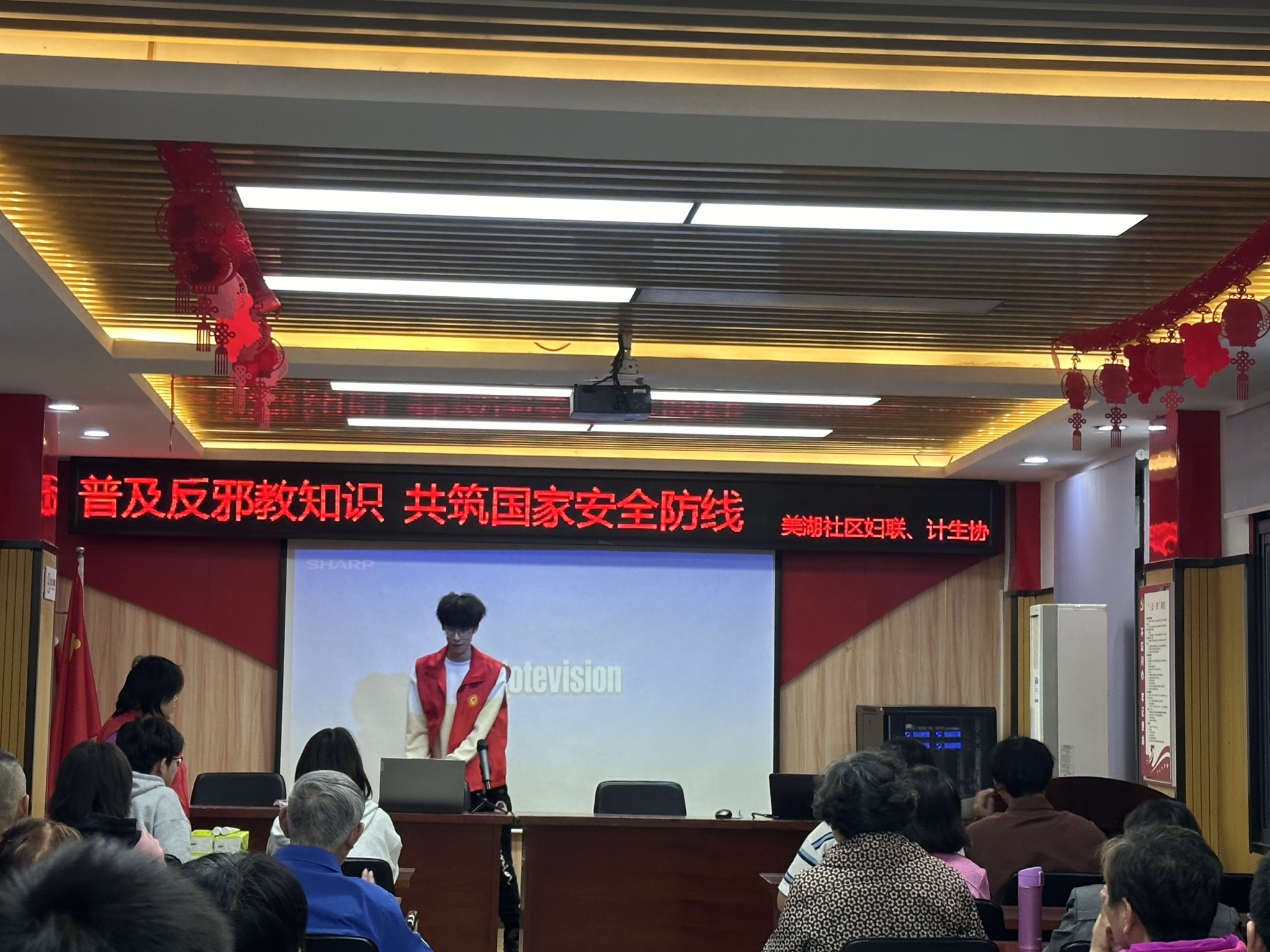 在社区会议室,同学们为社区居民讲解国家安全相关知识,介绍全民国家安全教育日时间、背景、意义以及国家安全内涵。社区居民认真倾听和学习。期间还进行了国家安全知识有奖问答活动,现场气氛热烈。