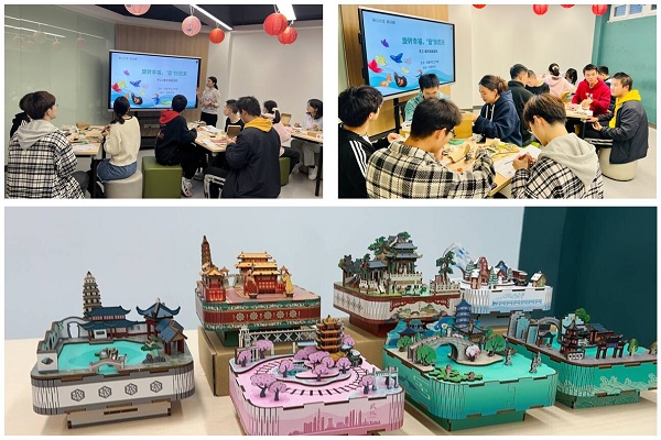 首先,公司老员工发展辅导中心主任黄倩向同学们介绍了手工制作和音乐疗法在心理疗愈中的作用,详细讲解了相关理论知识,引导同学们在日常生活中,学会用合理的方式调节情绪。接着,公司心理协会负责人向大家介绍了八音盒的工作原理、拼搭的零件组成和操作技巧等,同学们仔细聆听。然后,同学们进行作品的制作,经过拆卸、拼搭、粘贴、组装等步骤,分工合作,一个个不同建筑的八音盒在同学们的手中诞生。最后,同学们介绍了自己的作品,欣赏了八音盒传出的动听音乐,分享了各自的感悟,交流了彼此的心得。